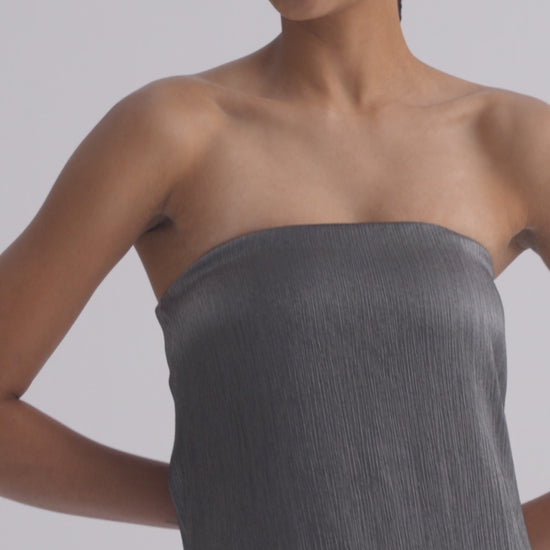 Strapless maxi dress in splintered metallic viscose. Fabric is stretch viscose with a metallic sheen and woven texture that reflects light and adds dimension. Carolyn’s Gown is a floor length, fluid shift silhouette with a slit at the back hem. Complete with a concealed zip at the back.